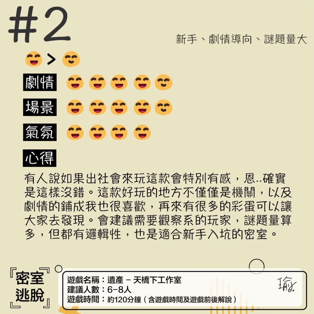 遺產的劇情飽滿有張力,隨著音樂故事推進,我們了解到每一間房間所代表的故事以及「老先生」的感受。我很喜歡遺產所帶來的劇情,也建議大家玩此密室的時候,可以多多觀察文字內容,以及所有謎題它背後的故事與用意。