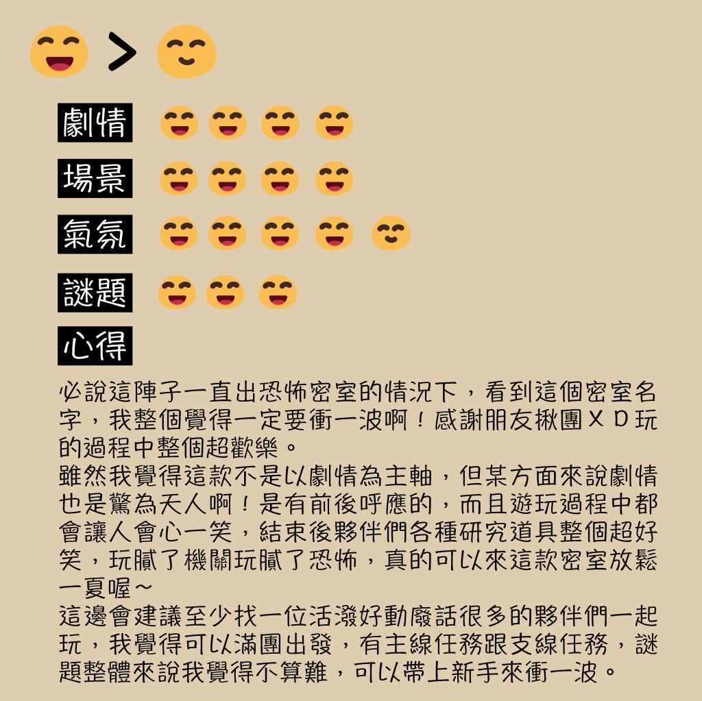 雖然我覺得這款不是以劇情為主軸,但某方面來說劇情也是驚為天人啊!是有前後呼應的,而且遊玩過程中都會讓人會心一笑,結束後夥伴們各種研究道具整個超好笑,玩膩機關恐怖,真的可以來這款密室放鬆一下喔~