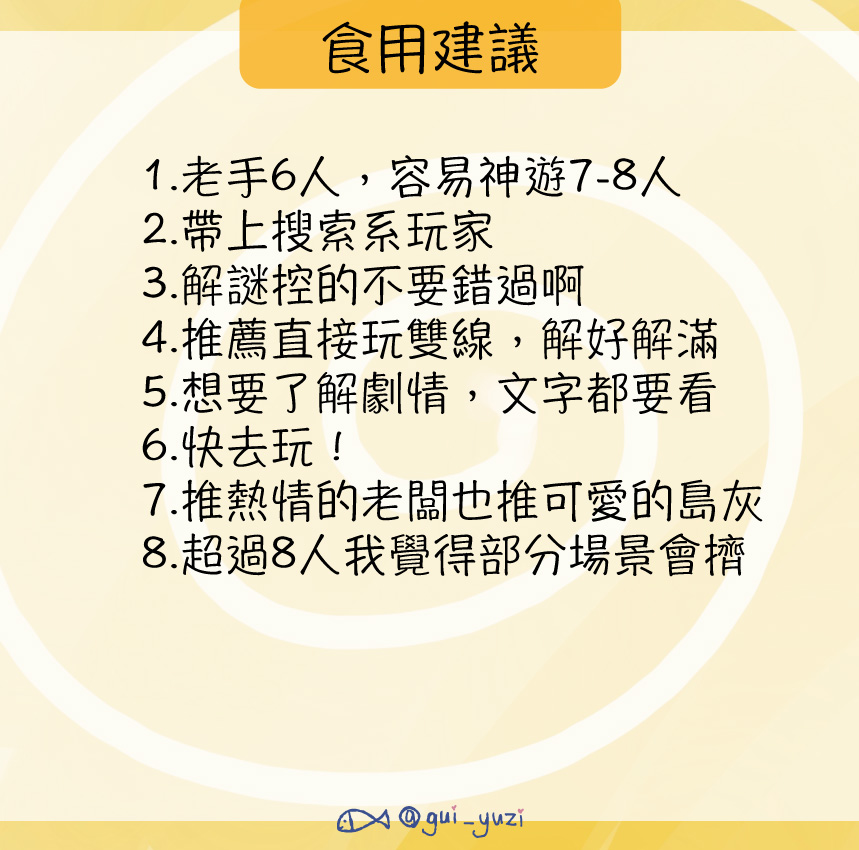 對於解謎控來說,這款也能解好解滿,以8人來說我覺得不至於到搶題目的感覺(除了某幾關對於8人來說會略多外,但普遍空間我覺得剛剛好)