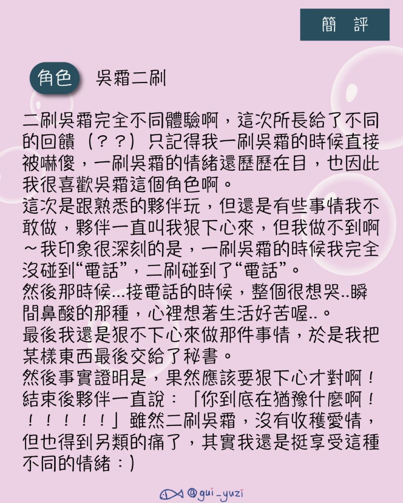 雖然我最後收到小林的一封信,原諒與不原諒我也不知道當下的心情,但沒有關係,其他時空的小林還是對我很好的!(什麼鬼☺️)而且體驗不同吳霜的心情,我真的覺得好棒!!!!!🤩