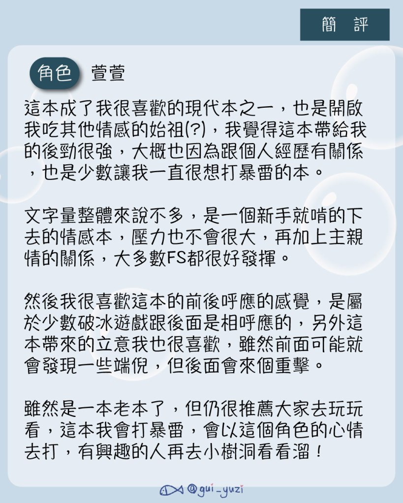 前期一樣是會有小小破冰,可能對於其他人是輕鬆,對我來說壓力好大,第一次體會到從頭到尾不同的情緒,這個角色真的帶給我很多有別於其他情感本的感受。尤其從頭到尾的時候,那些看似破冰的小遊戲,其實對於我來說,都是一刀又一刀,刀刀在心上。