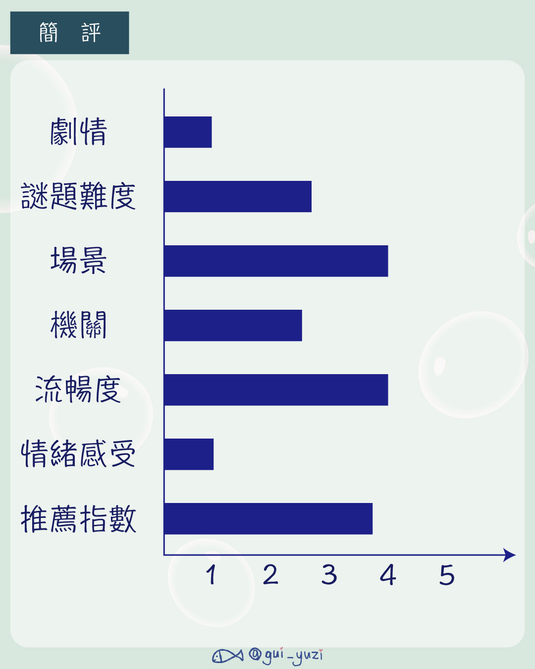 某一個場景有讓人嚇到的感覺,場景也沒有如說明的血腥,就一點點而已,但因為那個場景整個氛圍感有提升。我覺得以小品密室來說,這個場景已經算蠻棒的,且某一個場景還結合了一點點的解謎元素,讓人親身體驗的感覺,這是我最喜歡的部分XD