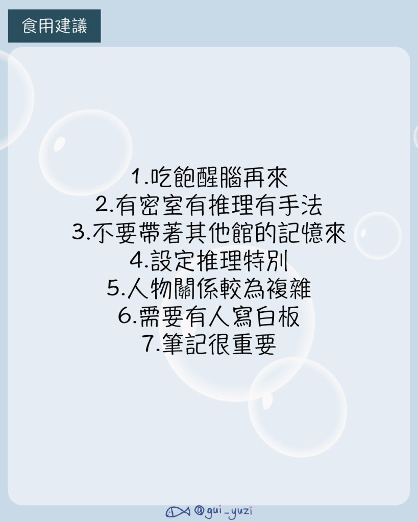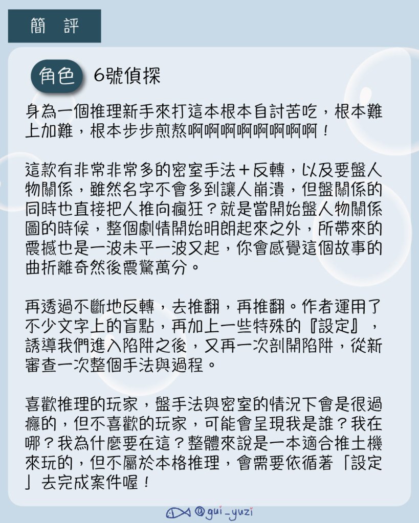 整體來說是適合喜歡密室推理的人衝一波,因為會有幾場密室手法可以盤,我自己雖然很少盤密室,但面對這樣的密室手法還是覺得新奇有趣。