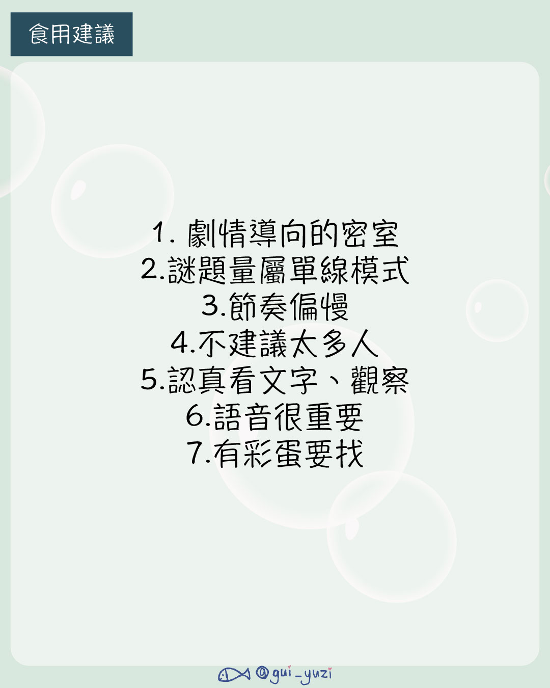 謎題整體來說是屬於單線式解謎,所以不建議太多人,但會建議所看到的找到的物品、解掉的謎題,都可以分享給夥伴們知道,再來語音的部分一定要認真聽,很重要啊!