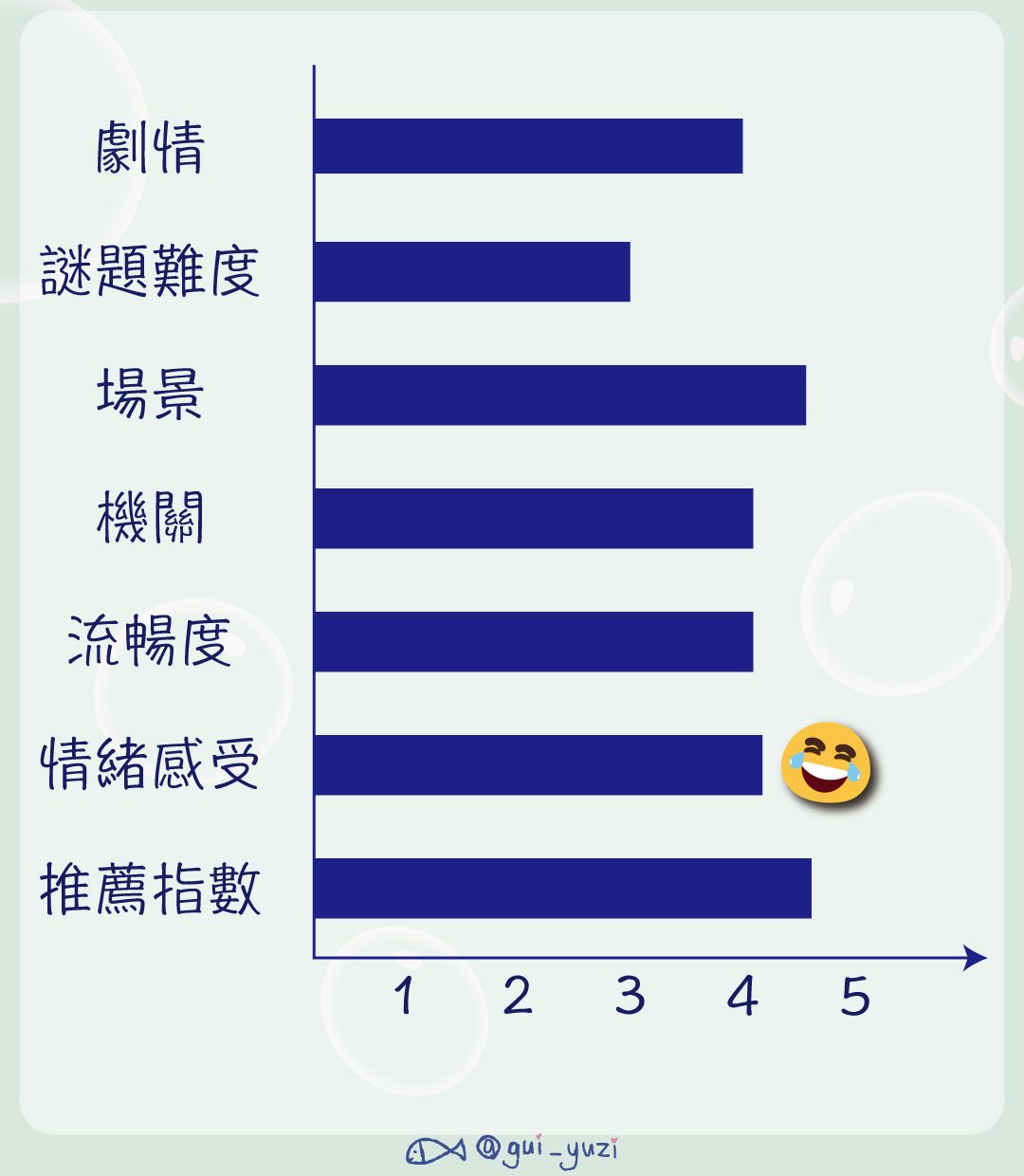 謎題主要以單線式解謎為主,雖然是單線解謎方式,但不至於大家都沒事做,反而有些部分都需要分工合作一起完成的,這點設計我覺得很棒~以機關、操作謎題居多,而且好玩又有趣!
