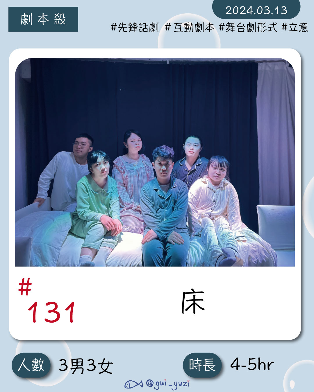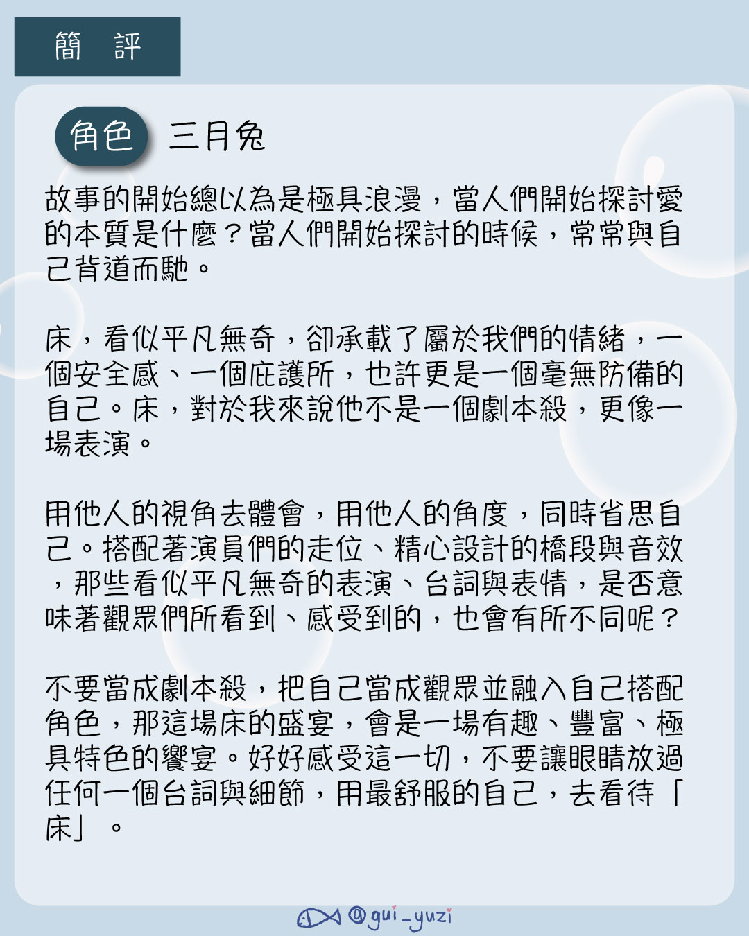 我喜歡輕鬆看劇的方式,用詼諧又幽默的方式,也許是反諷也許是每個人看待這件事情的看法不同,床是一部可以引發人去思考的作品,對我來說他不單單只是一本劇本殺,更是一場表演。