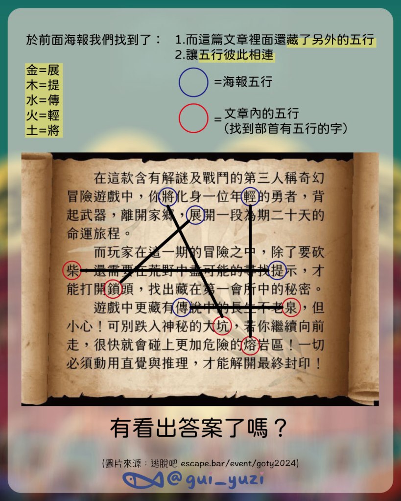 而這篇文章裡面還藏了另外的五行,所以我們除了原本海報裡的五行之外,還要找出這篇文章的五行喔!