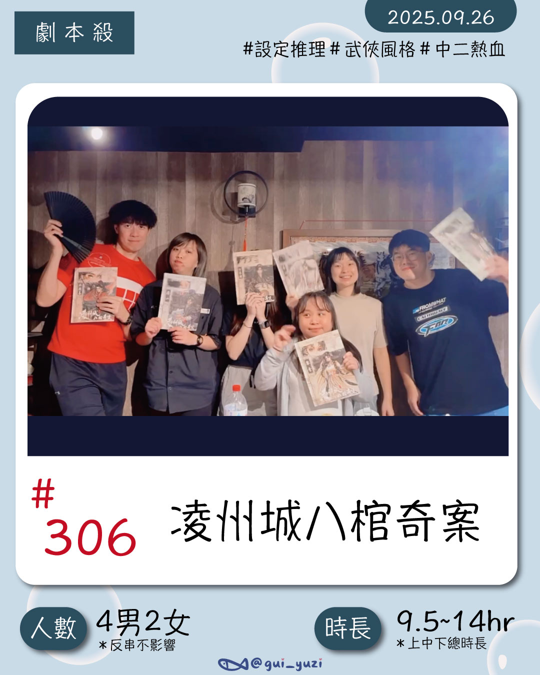 老實說我平常其實很少玩古風武俠類型的推理本,這本可能算是第一本?結果意外地非常喜歡。我原本沒有想過古風武俠題材的推理本,可以用這樣的方式去呈現。搭配劇本精美的畫風與設定,在遊玩的過程中真的會有一種自己正在武俠世界裡闖蕩江湖的感覺。